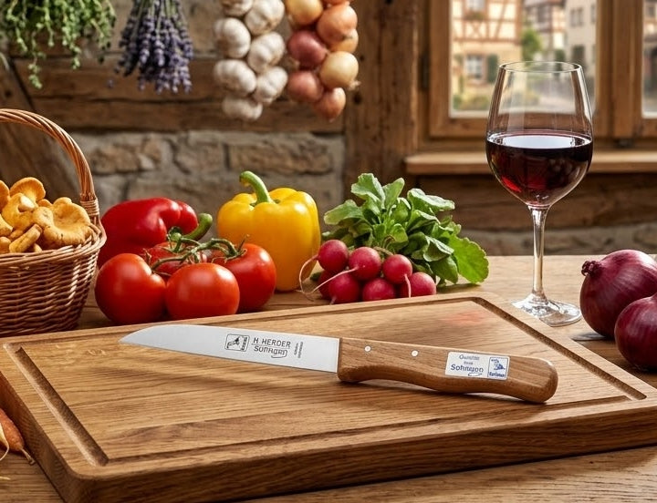 Erleben Sie echte Solinger Handwerkskunst. Dieses klassische Küchenmesser von H. Herder besticht durch seine außergewöhnliche Schnitthaltigkeit und traditionelle Fertigung. Ein Werkzeug für Kenner, die Wert auf Präzision und Langlebigkeit legen.