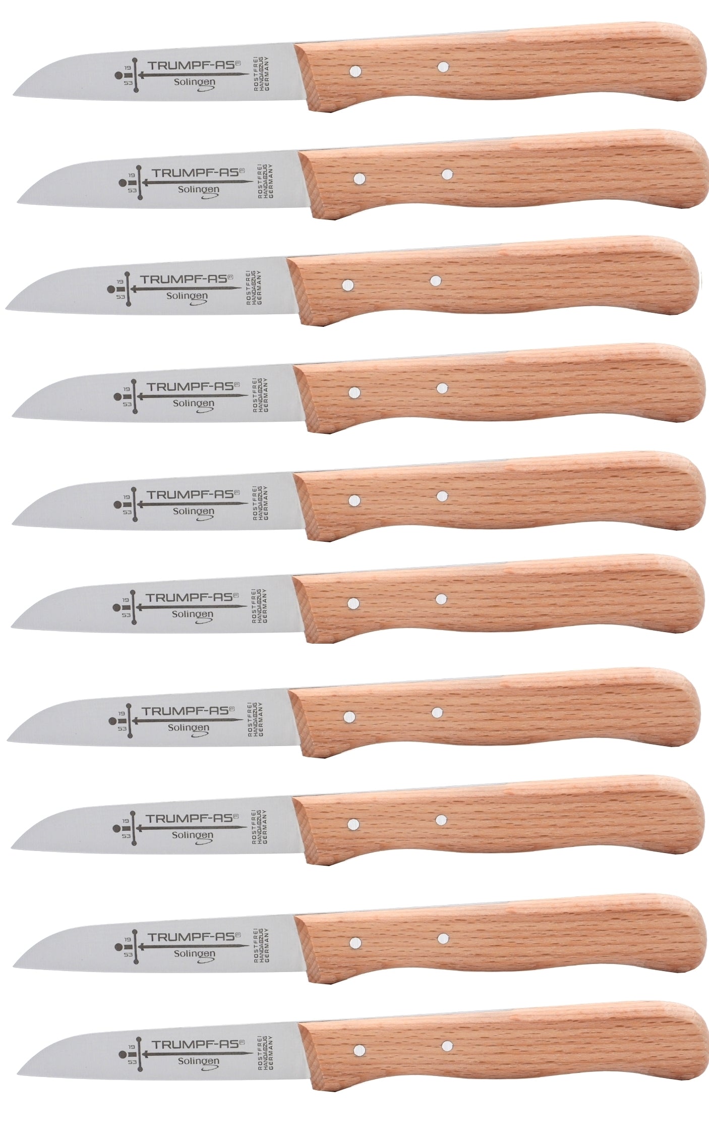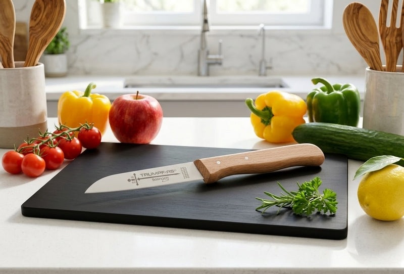 Erleben Sie Solinger Handwerkskunst in ihrer zeitlosesten Form. Das Original Trumpf-As Küchenmesser vereint erstklassige Materialqualität mit jahrzehntelanger Fertigungstradition. Dank des eisgehärteten Spezialstahls und des echten Handabzugs ist dieses Messer ein zuverlässiger Partner für feinste Schneidarbeiten in der Küche.